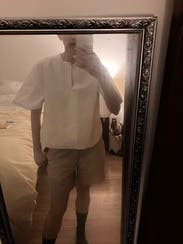 This will be staying in my closet for a bit. Fabric is stiff, but extremely chic and great for an elevated white shirt option. My size wasn't available so I sized up. It is a little big, but still work fine.