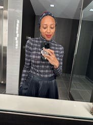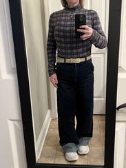 This plaid turtleneck is very soft and lightweight. First true to size for a fitted look.