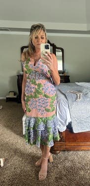 This dress was different and pretty! Had no stretch but wasn’t uncomfortable. Wore to a wedding 2 months postpartum and felt great.