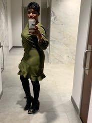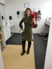 This dress is cute, I loved the fit and ruffle. Very flattering and feminine. The material shows all lines though - tights, bra etc. I also thought it was more green in person than the picture on RTR and even more than in the photo I submitted - it's a nice color.