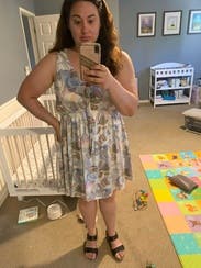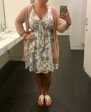 I liked this dress but probably could've worn a large or even a medium. It is elastic under the boobs and super flowy. I had to wear a tank underneath.
