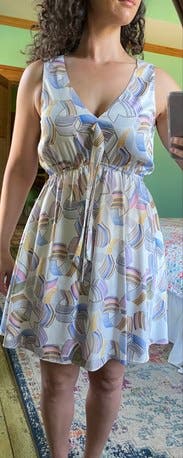 I loved this dress! Slightly large in the chest and low cut, which was surprising as I'm bustier. Probably could have sized down to medium. Silky and nice for everyday wear, a shower, or date night.