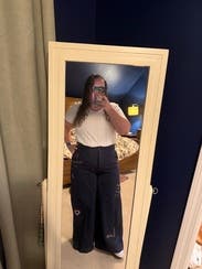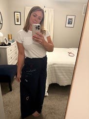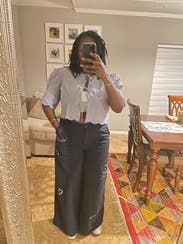 These are dramatic (palazzo legs feel like a big skirt to me) yet fun (embroidery and patches!) and so comfortable. I wore them a million times and eventually bought them with a coupon because I couldn’t bear to part with them.