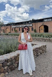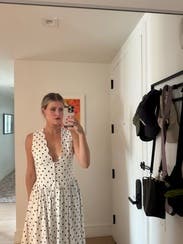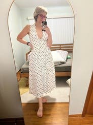 I’m 5’4” and this dress was about 6 inches too long on me for a midi look. It was also really low cut… almost had a nip slip multiple times. That being said, the quality is good, the polka dots are on trend, and it’s a really cute design!