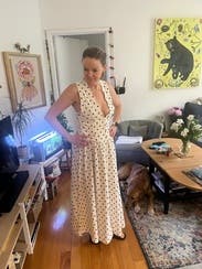 This was giving suburban housewife but make it sexy with the open chest - a bit confusing but got lots of compliments. It was slightly big on me so if between sizes I would size down, and it’s also long. I wore with flats and it came just above my ankles.