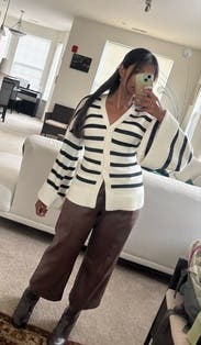 I've been tired of all the most basic looking sweaters on here (I mean it's supposed to be renting the runway!) so this sweater, while also basic, has a bit of drama with the oversized sleeves. They're not just oversized either the cut, the length is oversized. I have pretty long arms and the sleeves were long on me. Looks cute worn unbuttoned too! Also works with baggier jeans since the bodice is tailored and gives you shape/structure