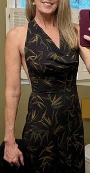 Super comfortable cowl neck backless dress. so felt like there was a bit too much fabric in the bust; while I know there needs to be excess for the cowl neck, I felt like there was too much extra. The fabric is also white on the underside and is unlined so I felt like it cheapened the look of the dress a little bit. That being said, it was great for a night!