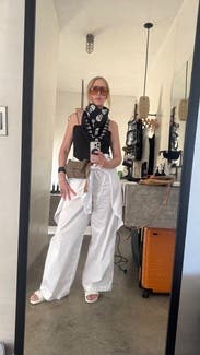 White anything terrifies me, so I love the option of renting. :) I wore these with a white top and made the look more boho. In the look, pictured… I wanted it to be a little edgier, so a skull scarf gave me that but I was still cool in the Mexican heat:) Renting again for the Maldives.