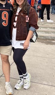 I wore this at a football game and it was the perfect jacket for a slightly chilly night. It is super large, but I’m glad I didn’t size down. It’s not the warmest or coziest jacket, but I still loved it. There is a velvet texture and it’s really beautiful in person.