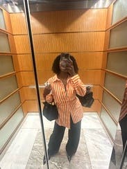 These pants are very flattering and they have a nice flair to them at the bottom. Would rent again