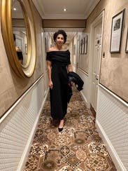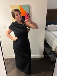 This dress was understated, but made me feel beautiful for a formal birthday dinner! Thick material which wrinkled a bit in the suitcase, but didn’t show when wearing. Long length- to my ankles and I am fairly tall. My two issues- no slit in the back, so walking was very difficult! I had to lift the bottom over my knees to walk easily. And finally- the top was beautiful, but even without moving my arms a lot, it shifted and I had to keep fixing it throughout the night. Still felt great. But I wouldn’t wear it to an event with dancing, because it really shifts with arms overhead!