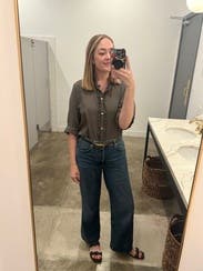 For a button down that has more of a “boyfriend” fit, this works tucked or loose. I liked the pattern and small ruffle details. This is a versatile top to add into the rotation during that transitional time between summer and fall that makes for awkward dressing (like a cold morning that turns into a 70 degree afternoon).