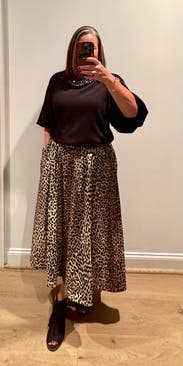 At 5’7” the back of the skirt just kisses the ground so I wore platform sandals with this to avoid it getting stuck in airport escalators but, the stretchy waistband, billowy skirt, and pockets made this a wildly comfortable piece. Animal print skirts are the easiest neutrals to pair with everything from graphic tees to sexy “going out tops” so this was such a versatile piece. I wore it once with a university of Washington shirt for running around town, once with a black Marcella shirt for a brunch, and another time with a simple white tee from banana republic for a flight/travel day. It worked just as well for running errands around town as it did for a day traveling to work.