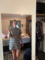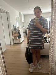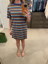 This shirt dress reminds me so much of those OP striped tees I wore in high school 💙. Great colors, cotton material was sturdy with some light stretch. Dress didn’t have a lot of shape, skimmed the frame. Hit mid thigh on my 5’5” height. Keeping it for a minute as it’s easy to wear and the colors allow for a few different ways to style!