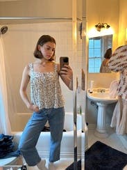 Loved this top! Wore it with denim shorts during the day and white jeans with denim jacket for dinner. I wore a bandeau bra under it, definitely need something. You can adjust the straps which is a plus! Contemplated buying it bc it was such an easy top.