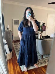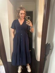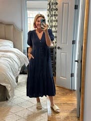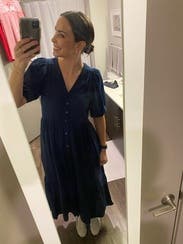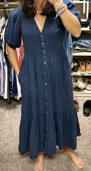 Perfect everyday dress. I sized down to an XS and wish an XXS was an option cuz the dress was still very loose. Pros: has pockets, fabric hides wrinkles well, ankle length for petites and buttons to make this breastfeeding friendly!