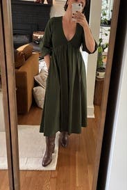 Chic, comfy, huge pockets, great color. Perfect transitional dress, and perfect length and overall proportions for shorter people. It’s definitely boobtastic but the skin is what makes it chic and not frumpy, with all the volume everywhere else.