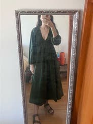 Loved the unique green color & the breathable cotton fabric that Xírena is known for. Elevated but still easy. If you’re more petite on top with a larger bust, this will look amazing on you. Good option for pregnancy! Fit can be tricky for me, so take this with a grain of salt: The proportions were a miss. (I'm 5'10", long torso/arms, broad shoulders, 36A/27/38). Snug in the shoulders, short arms that I had to pull up to my elbows to balance the silhouette (I appreciated the elasticized cuffs.) Oddly roomy in the bust, so it didn’t flatter my small chest, even with the smocking. The bodice sat high, which made the skirt puff out in an exaggerated way that didn’t seem intentional to the design. I could’ve fit a Great Dane under there 😂. The smocked back was lovely, flattering & my fav aspect of the dress. Overall, my body type made the vibe lean more "renaissance fair" than effortless chic. Ultimately decided not to wear. Returned with tags on.