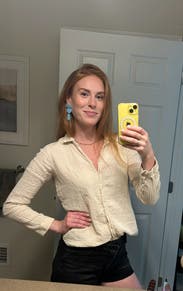 Basic off-white long sleeve shirt with collar- very small buttons (if one was missing, and I'm not saying one was missing because then this review might not get published, it would be hard to find one to replace it). That said, I tried it on & took photos to see if I'd want to order it again later. I don't think I will. There are more versatile basics out there. Liked: the color & length Neutral: very casual- the material is almost like gauze. It's not meant to be ironed- so it's always going to look a little not crisp. I don't think it worked with any buisness/professional attire. Didn't like: the floppy collar & tiny buttons