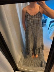 Super cute and easy to throw on and style. I got a ton of compliments. I wish it was just a tiny bit more form fitting or had less “flow” on a petite person, otherwise I would have bought it. Either way, it was a perfect weekend dress and really good quality.