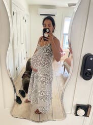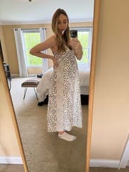 Wore during my third trimester, wasn't sure how it would fit but it fit wonderfully and was great when the weather was hot outside. Surprised it wasn't very see through without a bra!