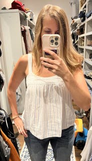 Cute lightweight tank top. Like that it has two sets of buttons to alter the length of straps. Baggy and comfy. Wasn't blown away by it, but worth one wear to a backyard BBQ 4th of July celebration in the middle of the Texas summer.