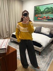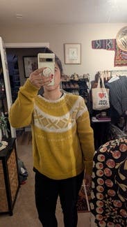 Loved this…wore it a ton while I had it. Perfect yellow. Wool sweater, but still kinda light weight. Tiny bit itchy but I thought it was fine. Hung nice. Felt like a skier from the 1940s.