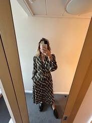 I loved wearing this dress and would love to own it! Fun pattern, great autumnal colors. I wore it to work under a blazer and to post-work cocktails and felt great. Works with a wide variety of shoes -- heels, boots -- and isn't too long, even though it's full-length (and I'm pretty short). Great dress!