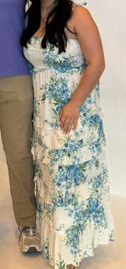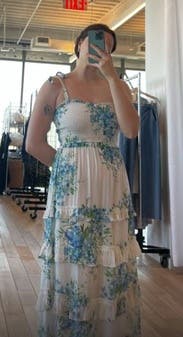 Loved this dress for a date night and dinner with a friend by the water. Perfect for an early summer night. The tiered bottom is cute but not too much. Love the smocking at the top, did not need a bra. And the tie straps allow for the perfect fit. Glad I got a large, might run a tad small