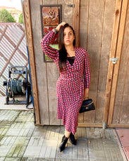 This wrap dress is comfortable and just beautiful. You can throw it on and go! Very flattering around the stomach and chest. I have small breasts and this dress covered everything perfectly. Easily adjustable, depending on your body style and size. I got sooo many compliments and felt very pretty with just the right amount of sexy. This dress would work on any age and body type. Rent it now!!