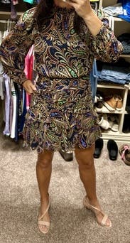 This dress has the best colors, a cute cut, and made me feel comfortable. It’s a must this fall! It’s on the shorter side but not too bad. It’s just shorter than my normal. You’ll be happy you rented this!