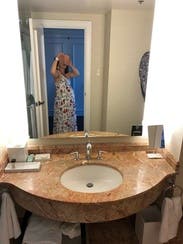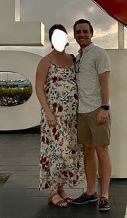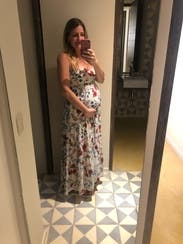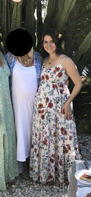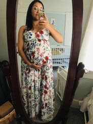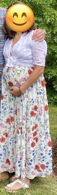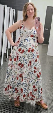 I was glad to have rented this dress for vacation but it fit a bit oddly at 31 weeks pregnant - there is SO much fabric below the bust that you’ll be grabbing it all every time you stand up from a chair, and likely tripping over the bottom a fair amount (I’m 5’7” and length isn’t usually an issue for me, but it was on this dress!). That said, if you can get over the fact that the flower pattern doesn’t line up along the skirt, it’s a pretty dress and double lined, so it’s thick without being hot (no panty line issues).