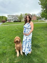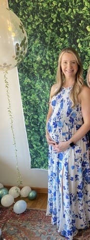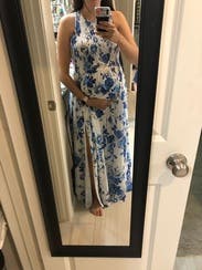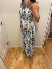I wore this dress for my baby shower and loved it! It doesn’t look specifically like a maternity dress but provided plenty of room for my bump. It’s very flowy, and the material is so comfortable. It was a little long, but I never felt like I was going to trip over it. Also because of the way the top is cut, I wore a sports bra with it instead of a regular bra so that the straps wouldn’t show.