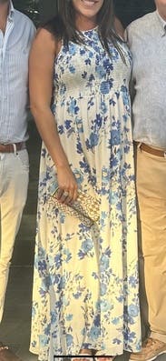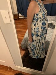 The flowy maxi moves well but was a bit too long for me. The top is a weird material that is too casual and the divots cut above the chest show your bra straps no matter how you convert them.