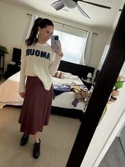 Such a cute oversized sweater to wear many bottoms. Wore with a midi skirt, leggings and jeans.