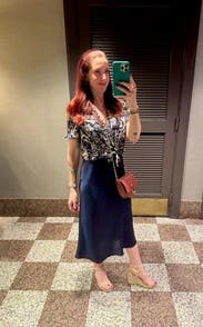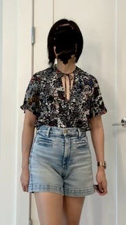 This top is beautiful, with one sparkly button detail up top that I particularly enjoyed! The butterfly print is fun but subtle. This top felt slightly narrow at my hips, which wasn’t an issue once I tucked it in. I would recommend sizing up if you are in between sizes and want to wear this untucked!